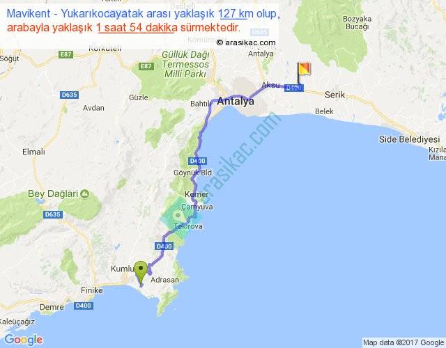 Mavikent - Yukarıkocayatak arası yaklaşık olarak 90 km/h ile yukarıda belirtilen sürede olup, iki yerin kuş uçuşu uzaklığı (mesafesi) 90'dir. Yolculuk otobüsle 2 saat 28 dakika sürmektedir.