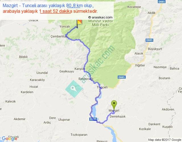 Mazgirt - Tunceli arası yaklaşık olarak 90 km/h ile yukarıda belirtilen sürede olup, iki yerin kuş uçuşu uzaklığı (mesafesi) 11'dir. Yolculuk otobüsle 52 dakika sürmektedir.