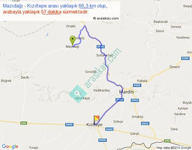 Mazıdağı - Kızıltepe arası yaklaşık olarak 90 km/h ile yukarıda belirtilen sürede olup, iki yerin kuş uçuşu uzaklığı (mesafesi) 33'dir. Yolculuk otobüsle 1 saat 14 dakika sürmektedir.