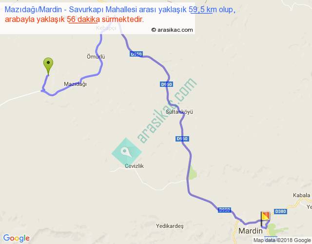 Mazıdağı Mardin - Savurkapı Mahallesi arası yaklaşık olarak 90 km/h ile yukarıda belirtilen sürede olup, iki yerin kuş uçuşu uzaklığı (mesafesi) 32'dir. Yolculuk otobüsle 1 saat 12 dakika sürmektedir.