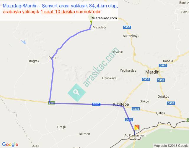 Mazıdağı Mardin - Şenyurt arası yaklaşık olarak 90 km/h ile yukarıda belirtilen sürede olup, iki yerin kuş uçuşu uzaklığı (mesafesi) 48'dir. Yolculuk otobüsle 1 saat 31 dakika sürmektedir.