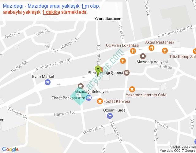 Mazıdağı - Mazıdağı arası yaklaşık olarak 90 km/h ile yukarıda belirtilen sürede olup, iki yerin kuş uçuşu uzaklığı (mesafesi) 0'dir. Yolculuk otobüsle 1 dakika sürmektedir.