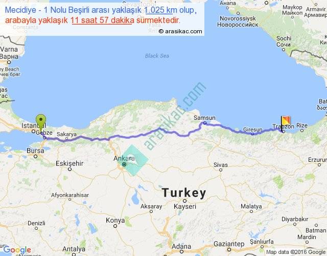 Mecidiye - 1 Nolu Beşirli arası yaklaşık olarak 90 km/h ile yukarıda belirtilen sürede olup, iki yerin kuş uçuşu uzaklığı (mesafesi) 865'dir. Eğer belirtilen yerler arasında uçak seferi var ise bu süre uçakla 1 saat 19 dakika'ya kadar düşebilir. Yolculuk otobüsle 15 saat 32 dakika sürmektedir.