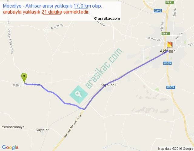 Mecidiye - Akhisar arası yaklaşık olarak 90 km/h ile yukarıda belirtilen sürede olup, iki yerin kuş uçuşu uzaklığı (mesafesi) 14'dir. Yolculuk otobüsle 27 dakika sürmektedir.