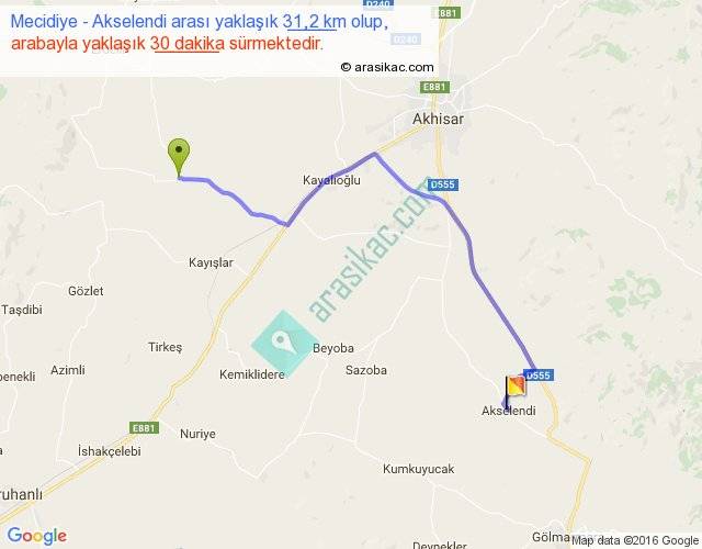 Mecidiye - Akselendi arası yaklaşık olarak 90 km/h ile yukarıda belirtilen sürede olup, iki yerin kuş uçuşu uzaklığı (mesafesi) 22'dir. Yolculuk otobüsle 39 dakika sürmektedir.