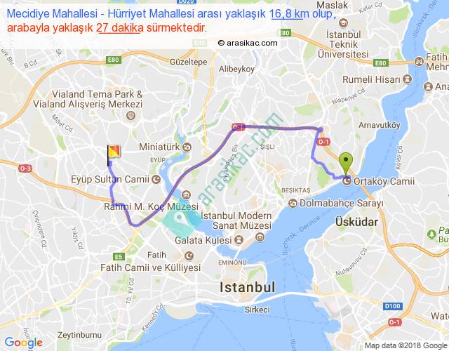 Mecidiye Mahallesi - Hürriyet Mahallesi arası yaklaşık olarak 90 km/h ile yukarıda belirtilen sürede olup, iki yerin kuş uçuşu uzaklığı (mesafesi) 10'dir. Yolculuk otobüsle 35 dakika sürmektedir.