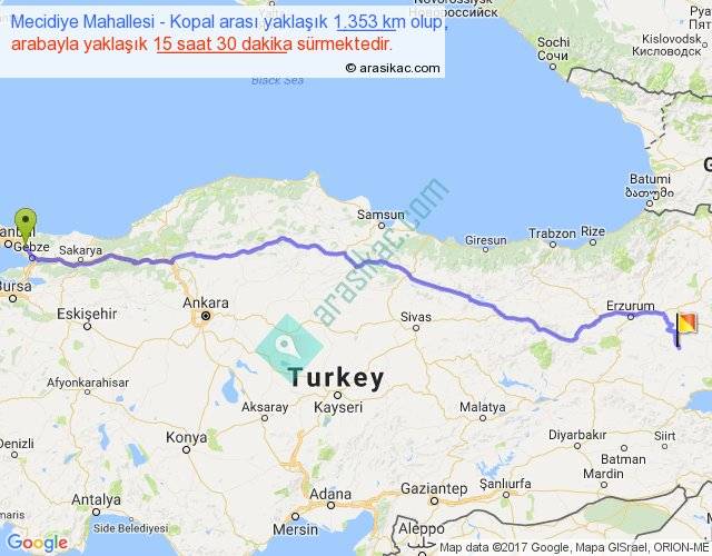 Mecidiye Mahallesi - Kopal arası yaklaşık olarak 90 km/h ile yukarıda belirtilen sürede olup, iki yerin kuş uçuşu uzaklığı (mesafesi) 1101'dir. Eğer belirtilen yerler arasında uçak seferi var ise bu süre uçakla 1 saat 41 dakika'ya kadar düşebilir. Yolculuk otobüsle 20 saat 9 dakika sürmektedir.