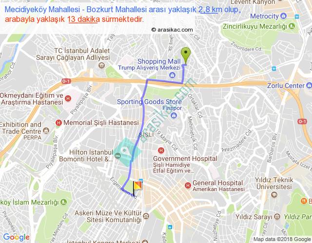 Mecidiyeköy Mahallesi - Bozkurt Mahallesi arası yaklaşık olarak 90 km/h ile yukarıda belirtilen sürede olup, iki yerin kuş uçuşu uzaklığı (mesafesi) 2'dir. Yolculuk otobüsle 16 dakika sürmektedir.