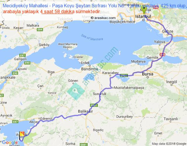 Mecidiyeköy Mahallesi - Paşa Koyu Şeytan Sofrası Yolu No: 1 arası yaklaşık olarak 90 km/h ile yukarıda belirtilen sürede olup, iki yerin kuş uçuşu uzaklığı (mesafesi) 279'dir. Eğer belirtilen yerler arasında uçak seferi var ise bu süre uçakla 25 dakika'ya kadar düşebilir. Yolculuk otobüsle 6 saat 27 dakika sürmektedir.
