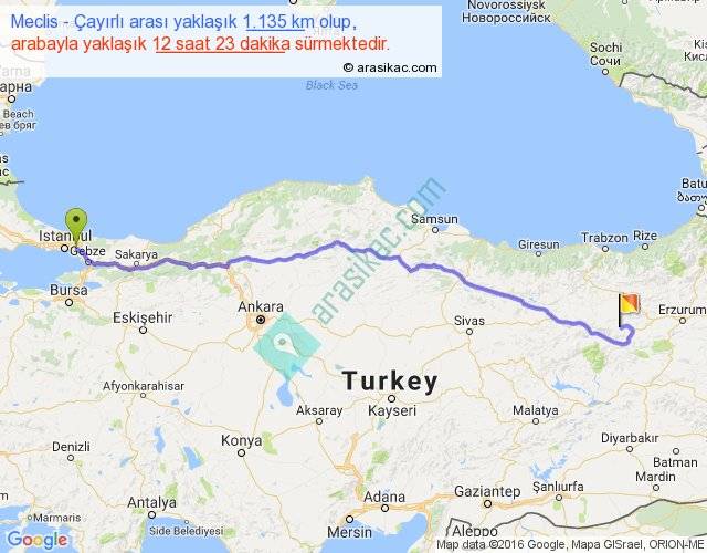 Meclis - Çayırlı arası yaklaşık olarak 90 km/h ile yukarıda belirtilen sürede olup, iki yerin kuş uçuşu uzaklığı (mesafesi) 921'dir. Eğer belirtilen yerler arasında uçak seferi var ise bu süre uçakla 1 saat 25 dakika'ya kadar düşebilir. Yolculuk otobüsle 16 saat 5 dakika sürmektedir.