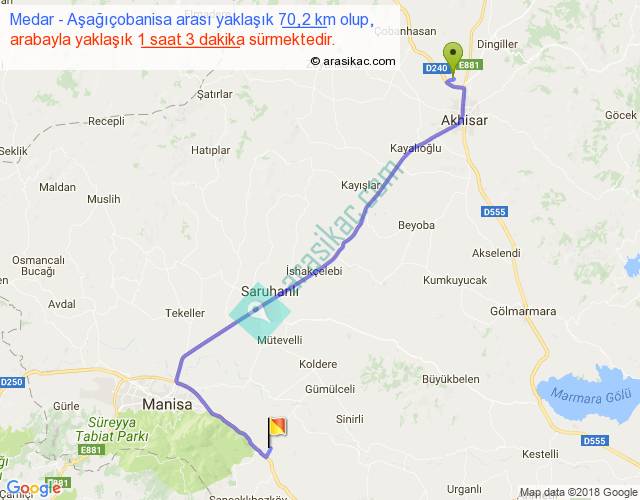 Medar - Aşağıçobanisa arası yaklaşık olarak 90 km/h ile yukarıda belirtilen sürede olup, iki yerin kuş uçuşu uzaklığı (mesafesi) 49'dir. Yolculuk otobüsle 1 saat 21 dakika sürmektedir.