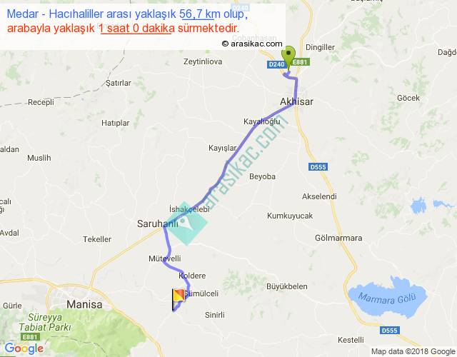 Medar - Hacıhaliller arası yaklaşık olarak 90 km/h ile yukarıda belirtilen sürede olup, iki yerin kuş uçuşu uzaklığı (mesafesi) 44'dir. Yolculuk otobüsle 1 saat 18 dakika sürmektedir.
