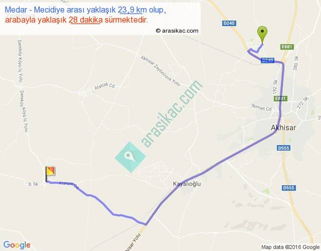 Medar - Mecidiye arası yaklaşık olarak 90 km/h ile yukarıda belirtilen sürede olup, iki yerin kuş uçuşu uzaklığı (mesafesi) 15'dir. Yolculuk otobüsle 36 dakika sürmektedir.