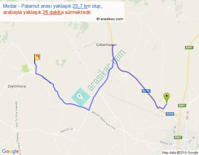Medar - Palamut arası yaklaşık olarak 90 km/h ile yukarıda belirtilen sürede olup, iki yerin kuş uçuşu uzaklığı (mesafesi) 13'dir. Yolculuk otobüsle 33 dakika sürmektedir.