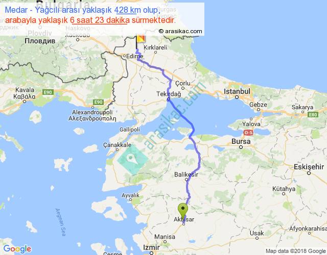 Medar - Yağcılı arası yaklaşık olarak 90 km/h ile yukarıda belirtilen sürede olup, iki yerin kuş uçuşu uzaklığı (mesafesi) 323'dir. Eğer belirtilen yerler arasında uçak seferi var ise bu süre uçakla 29 dakika'ya kadar düşebilir. Yolculuk otobüsle 8 saat 17 dakika sürmektedir.