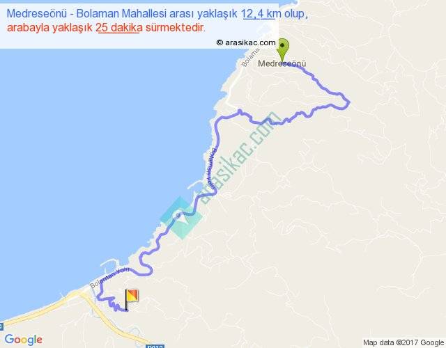 Medreseönü - Bolaman Mahallesi arası yaklaşık olarak 90 km/h ile yukarıda belirtilen sürede olup, iki yerin kuş uçuşu uzaklığı (mesafesi) 6'dir. Yolculuk otobüsle 32 dakika sürmektedir.