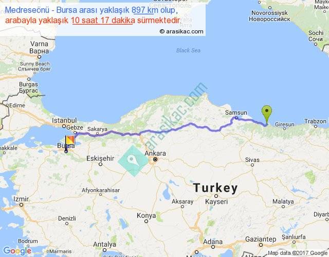 Medreseönü - Bursa arası yaklaşık olarak 90 km/h ile yukarıda belirtilen sürede olup, iki yerin kuş uçuşu uzaklığı (mesafesi) 725'dir. Eğer belirtilen yerler arasında uçak seferi var ise bu süre uçakla 1 saat 06 dakika'ya kadar düşebilir. Yolculuk otobüsle 13 saat 22 dakika sürmektedir.