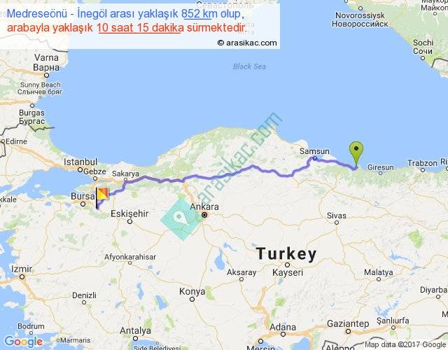 Medreseönü - İnegöl arası yaklaşık olarak 90 km/h ile yukarıda belirtilen sürede olup, iki yerin kuş uçuşu uzaklığı (mesafesi) 690'dir. Eğer belirtilen yerler arasında uçak seferi var ise bu süre uçakla 1 saat 03 dakika'ya kadar düşebilir. Yolculuk otobüsle 13 saat 19 dakika sürmektedir.