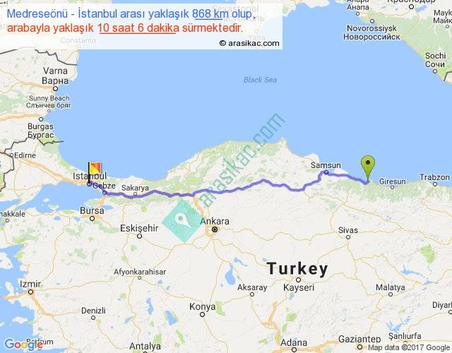 Medreseönü - İstanbul arası yaklaşık olarak 90 km/h ile yukarıda belirtilen sürede olup, iki yerin kuş uçuşu uzaklığı (mesafesi) 721'dir. Eğer belirtilen yerler arasında uçak seferi var ise bu süre uçakla 1 saat 06 dakika'ya kadar düşebilir. Yolculuk otobüsle 13 saat 7 dakika sürmektedir.