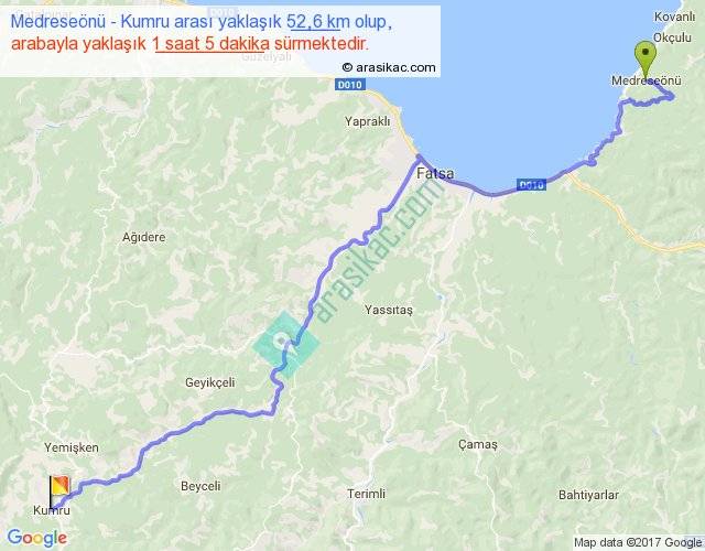Medreseönü - Kumru arası yaklaşık olarak 90 km/h ile yukarıda belirtilen sürede olup, iki yerin kuş uçuşu uzaklığı (mesafesi) 38'dir. Yolculuk otobüsle 1 saat 24 dakika sürmektedir.