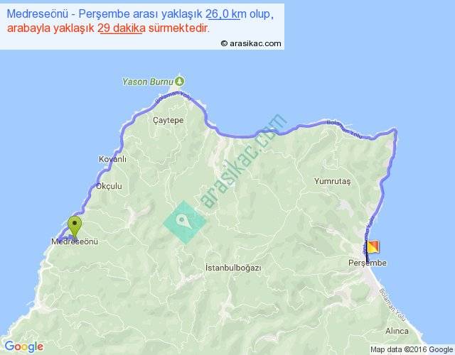 Medreseönü - Perşembe arası yaklaşık olarak 90 km/h ile yukarıda belirtilen sürede olup, iki yerin kuş uçuşu uzaklığı (mesafesi) 12'dir. Yolculuk otobüsle 37 dakika sürmektedir.
