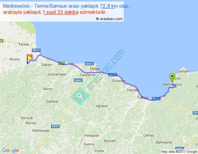 Medreseönü - Terme Samsun arası yaklaşık olarak 90 km/h ile yukarıda belirtilen sürede olup, iki yerin kuş uçuşu uzaklığı (mesafesi) 54'dir. Yolculuk otobüsle 1 saat 47 dakika sürmektedir.
