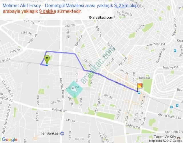 Mehmet Akif Ersoy - Demetgül Mahallesi arası yaklaşık olarak 90 km/h ile yukarıda belirtilen sürede olup, iki yerin kuş uçuşu uzaklığı (mesafesi) 2'dir. Yolculuk otobüsle 11 dakika sürmektedir.