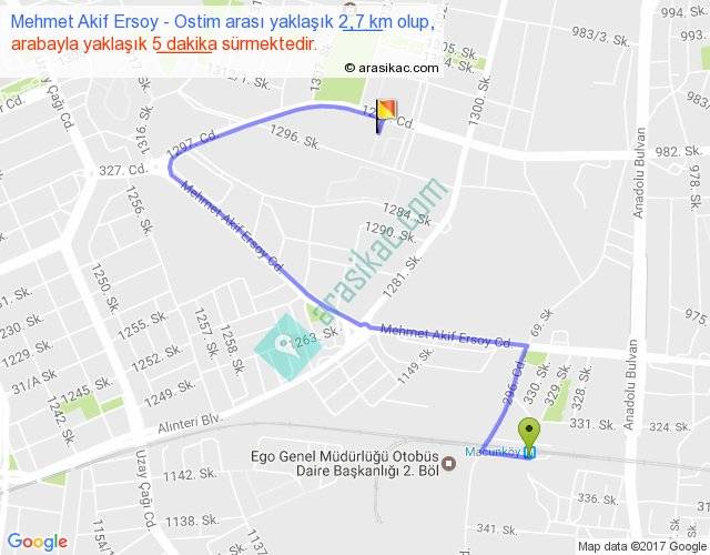 Mehmet Akif Ersoy - Ostim arası yaklaşık olarak 90 km/h ile yukarıda belirtilen sürede olup, iki yerin kuş uçuşu uzaklığı (mesafesi) 1'dir. Yolculuk otobüsle 6 dakika sürmektedir.