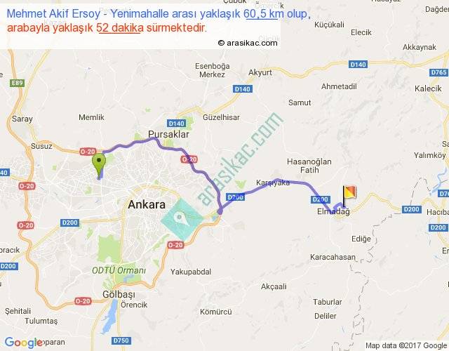 Mehmet Akif Ersoy - Yenimahalle arası yaklaşık olarak 90 km/h ile yukarıda belirtilen sürede olup, iki yerin kuş uçuşu uzaklığı (mesafesi) 41'dir. Yolculuk otobüsle 1 saat 7 dakika sürmektedir.