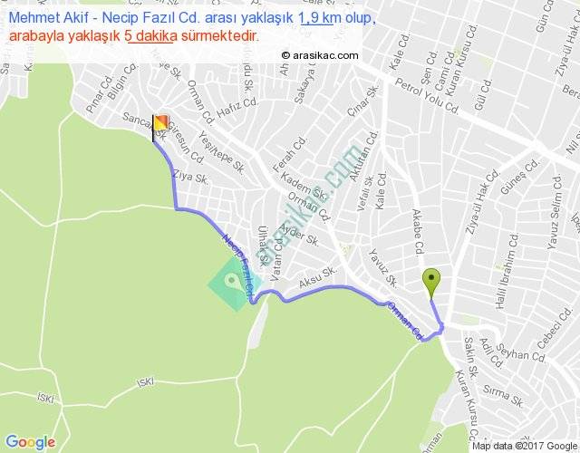 Mehmet Akif - Necip Fazıl Cd. arası yaklaşık olarak 90 km/h ile yukarıda belirtilen sürede olup, iki yerin kuş uçuşu uzaklığı (mesafesi) 1'dir. Yolculuk otobüsle 6 dakika sürmektedir.