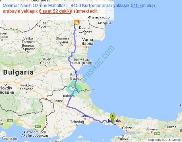 Mehmet Nesih Özmen Mahallesi - 9450 Kurtpınar arası yaklaşık olarak 90 km/h ile yukarıda belirtilen sürede olup, iki yerin kuş uçuşu uzaklığı (mesafesi) 325'dir. Eğer belirtilen yerler arasında uçak seferi var ise bu süre uçakla 30 dakika'ya kadar düşebilir. Yolculuk otobüsle 8 saat 55 dakika sürmektedir.