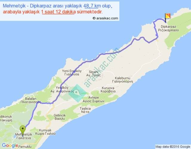 Mehmetçik - Dipkarpaz arası yaklaşık olarak 90 km/h ile yukarıda belirtilen sürede olup, iki yerin kuş uçuşu uzaklığı (mesafesi) 38'dir. Yolculuk otobüsle 1 saat 33 dakika sürmektedir.