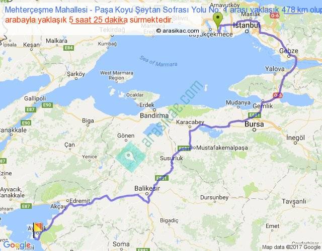 Mehterçeşme Mahallesi - Paşa Koyu Şeytan Sofrası Yolu No: 1 arası yaklaşık olarak 90 km/h ile yukarıda belirtilen sürede olup, iki yerin kuş uçuşu uzaklığı (mesafesi) 256'dir. Eğer belirtilen yerler arasında uçak seferi var ise bu süre uçakla 23 dakika'ya kadar düşebilir. Yolculuk otobüsle 7 saat 2 dakika sürmektedir.
