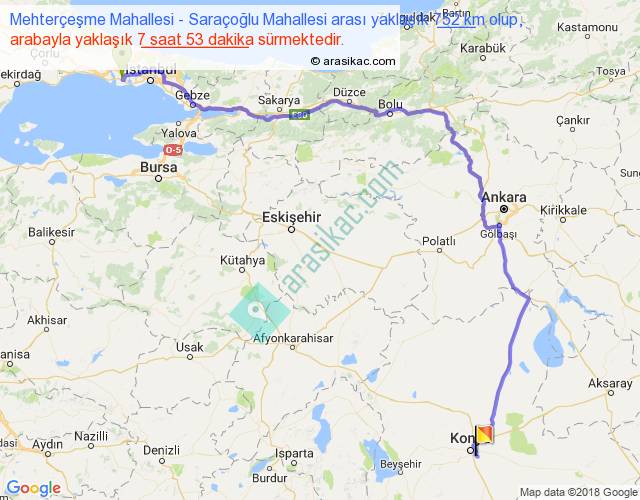 Mehterçeşme Mahallesi - Saraçoğlu Mahallesi arası yaklaşık olarak 90 km/h ile yukarıda belirtilen sürede olup, iki yerin kuş uçuşu uzaklığı (mesafesi) 486'dir. Eğer belirtilen yerler arasında uçak seferi var ise bu süre uçakla 44 dakika'ya kadar düşebilir. Yolculuk otobüsle 10 saat 14 dakika sürmektedir.
