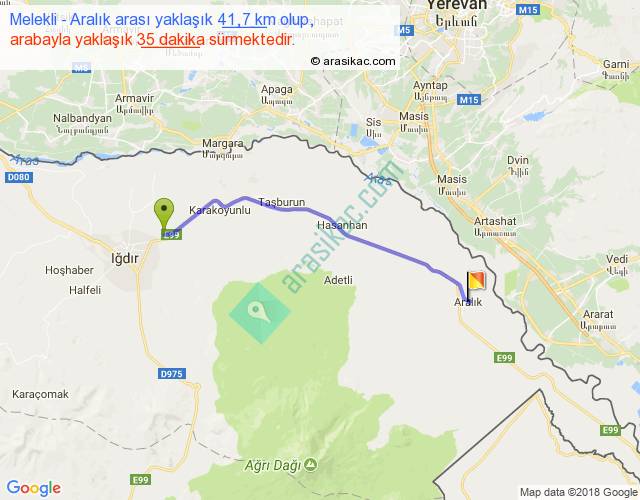Melekli - Aralık arası yaklaşık olarak 90 km/h ile yukarıda belirtilen sürede olup, iki yerin kuş uçuşu uzaklığı (mesafesi) 36'dir. Yolculuk otobüsle 45 dakika sürmektedir.