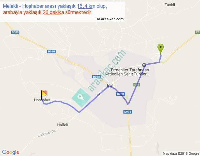 Melekli - Hoşhaber arası yaklaşık olarak 90 km/h ile yukarıda belirtilen sürede olup, iki yerin kuş uçuşu uzaklığı (mesafesi) 12'dir. Yolculuk otobüsle 33 dakika sürmektedir.