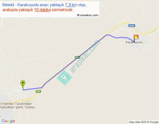 Melekli - Karakoyunlu arası yaklaşık olarak 90 km/h ile yukarıda belirtilen sürede olup, iki yerin kuş uçuşu uzaklığı (mesafesi) 7'dir. Yolculuk otobüsle 13 dakika sürmektedir.