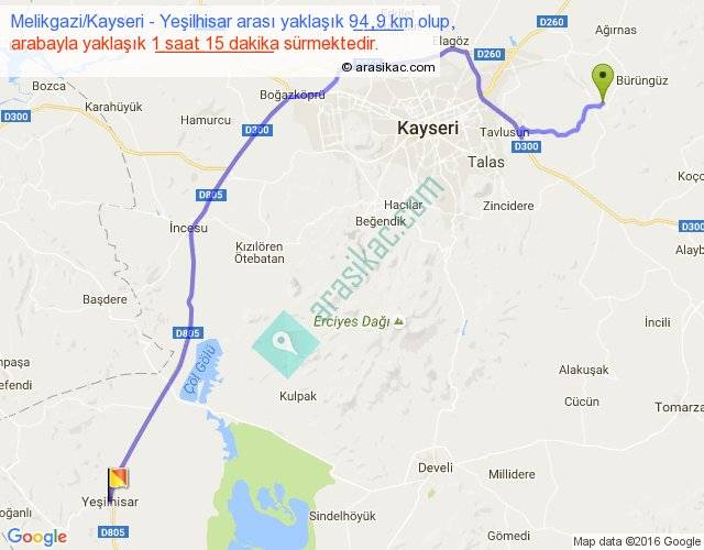 Melikgazi Kayseri - Yeşilhisar arası yaklaşık olarak 90 km/h ile yukarıda belirtilen sürede olup, iki yerin kuş uçuşu uzaklığı (mesafesi) 68'dir. Yolculuk otobüsle 1 saat 37 dakika sürmektedir.