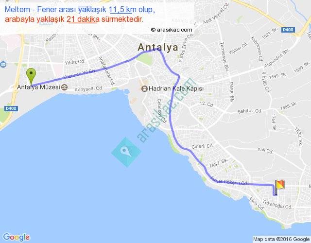 Meltem - Fener arası yaklaşık olarak 90 km/h ile yukarıda belirtilen sürede olup, iki yerin kuş uçuşu uzaklığı (mesafesi) 8'dir. Yolculuk otobüsle 27 dakika sürmektedir.