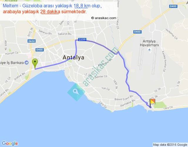 Meltem - Güzeloba arası yaklaşık olarak 90 km/h ile yukarıda belirtilen sürede olup, iki yerin kuş uçuşu uzaklığı (mesafesi) 13'dir. Yolculuk otobüsle 36 dakika sürmektedir.
