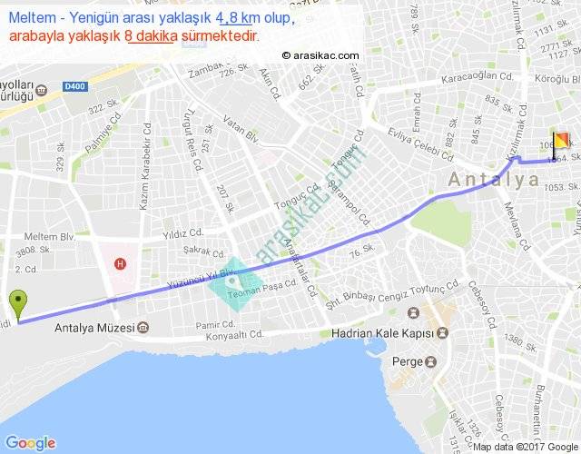 Meltem - Yenigün arası yaklaşık olarak 90 km/h ile yukarıda belirtilen sürede olup, iki yerin kuş uçuşu uzaklığı (mesafesi) 5'dir. Yolculuk otobüsle 10 dakika sürmektedir.