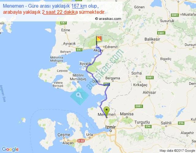Menemen - Güre arası yaklaşık olarak 90 km/h ile yukarıda belirtilen sürede olup, iki yerin kuş uçuşu uzaklığı (mesafesi) 112'dir. Yolculuk otobüsle 3 saat 4 dakika sürmektedir.