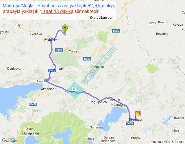 Menteşe Muğla - Beyobası arası yaklaşık olarak 90 km/h ile yukarıda belirtilen sürede olup, iki yerin kuş uçuşu uzaklığı (mesafesi) 46'dir. Yolculuk otobüsle 1 saat 34 dakika sürmektedir.