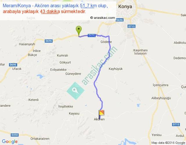 Meram Konya - Akören arası yaklaşık olarak 90 km/h ile yukarıda belirtilen sürede olup, iki yerin kuş uçuşu uzaklığı (mesafesi) 35'dir. Yolculuk otobüsle 55 dakika sürmektedir.