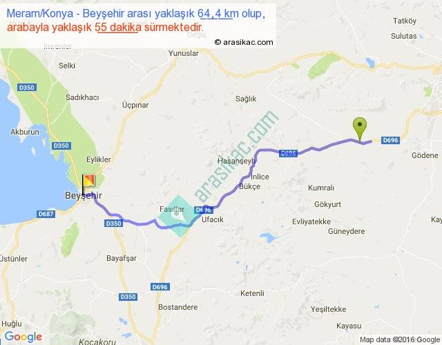 Meram Konya - Beyşehir arası yaklaşık olarak 90 km/h ile yukarıda belirtilen sürede olup, iki yerin kuş uçuşu uzaklığı (mesafesi) 49'dir. Yolculuk otobüsle 1 saat 11 dakika sürmektedir.