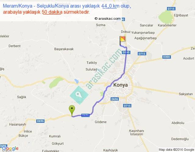 Meram Konya - Selçuklu Konya arası yaklaşık olarak 90 km/h ile yukarıda belirtilen sürede olup, iki yerin kuş uçuşu uzaklığı (mesafesi) 34'dir. Yolculuk otobüsle 1 saat 5 dakika sürmektedir.