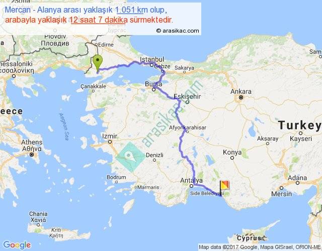 Mercan - Alanya arası yaklaşık olarak 90 km/h ile yukarıda belirtilen sürede olup, iki yerin kuş uçuşu uzaklığı (mesafesi) 657'dir. Eğer belirtilen yerler arasında uçak seferi var ise bu süre uçakla 1 saat 00 dakika'ya kadar düşebilir. Yolculuk otobüsle 15 saat 45 dakika sürmektedir.