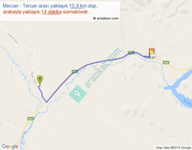 Mercan - Tercan arası yaklaşık olarak 90 km/h ile yukarıda belirtilen sürede olup, iki yerin kuş uçuşu uzaklığı (mesafesi) 11'dir. Yolculuk otobüsle 18 dakika sürmektedir.
