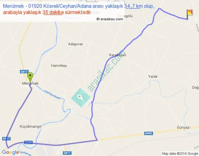 Mercimek - 01920 Kösreli Ceyhan Adana arası yaklaşık olarak 90 km/h ile yukarıda belirtilen sürede olup, iki yerin kuş uçuşu uzaklığı (mesafesi) 17'dir. Yolculuk otobüsle 45 dakika sürmektedir.