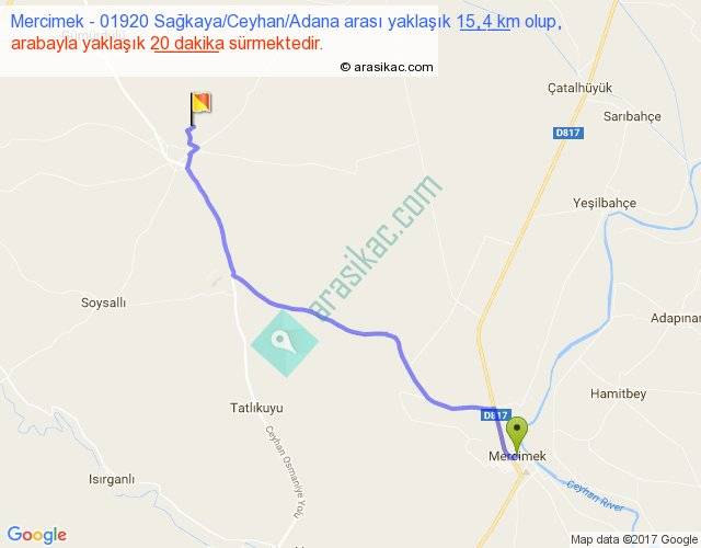 Mercimek - 01920 Sağkaya Ceyhan Adana arası yaklaşık olarak 90 km/h ile yukarıda belirtilen sürede olup, iki yerin kuş uçuşu uzaklığı (mesafesi) 13'dir. Yolculuk otobüsle 26 dakika sürmektedir.